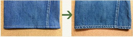 こうすると履いてるうちに裾のヨレ具合とアタリがいい感じになる簡単にいうとこれの右になる