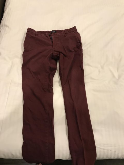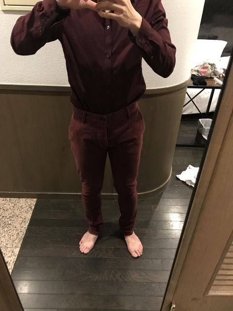 ボルドーのパンツ、ステンカラーコートなんかと合わせるにはええやろけどもう暑くて着れない